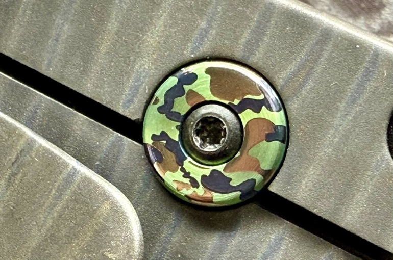 M81 :Woodland" style camo LBS button! Anodized and Lasered patterned Titanium! Available in "Flat" (OEM Strider and Hinderer shape) Titanium Replacement Hinderer LBS buttons, for Strider and ZT brands. (May also fit other makes/models with 3/8 od x.090 thick LBS buttons).